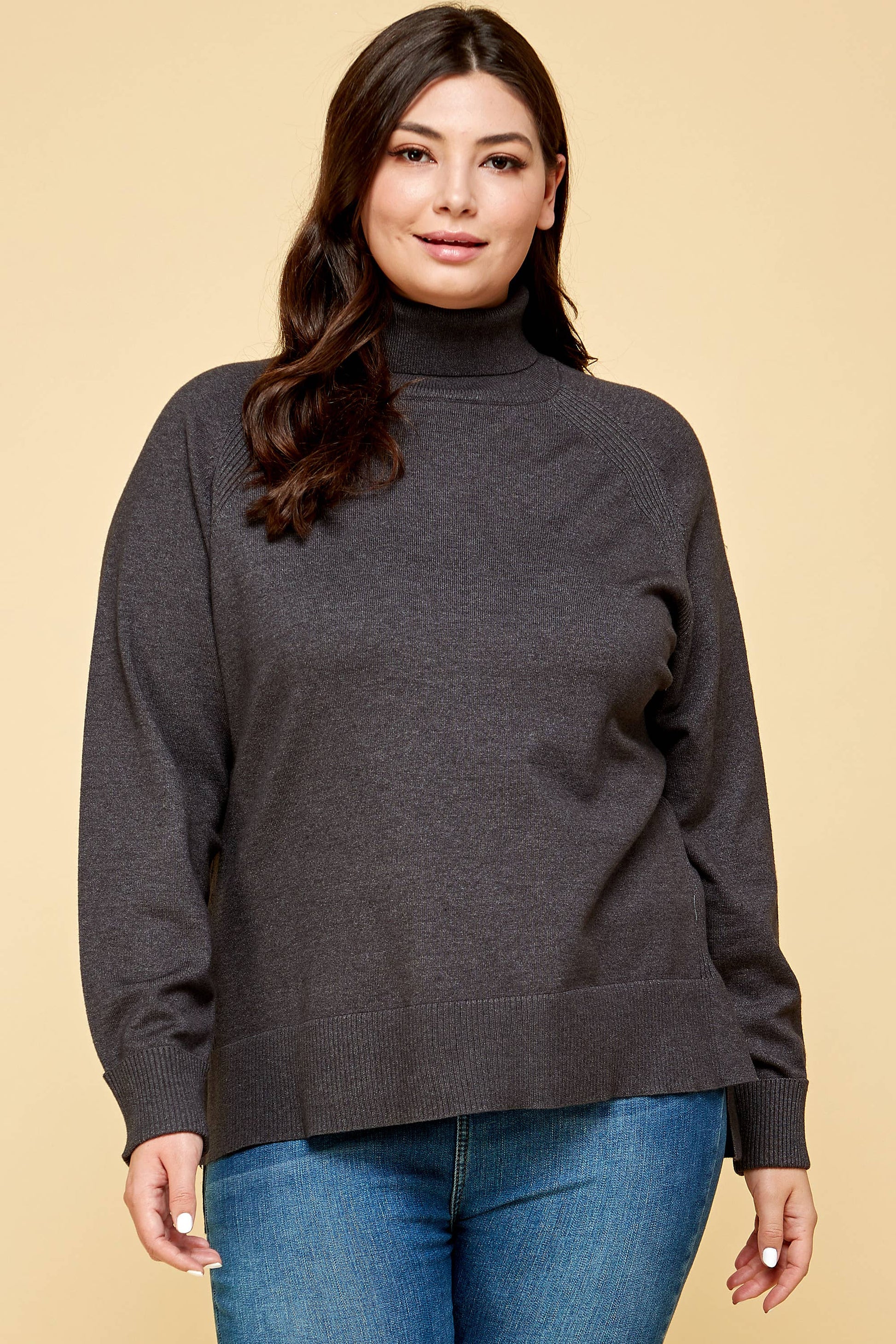 Plus Size High-Quality Buttery Soft Solid Knit Two Tone Turtleneck High Low Hem Sweater with Ribbed Detail and Side Slits