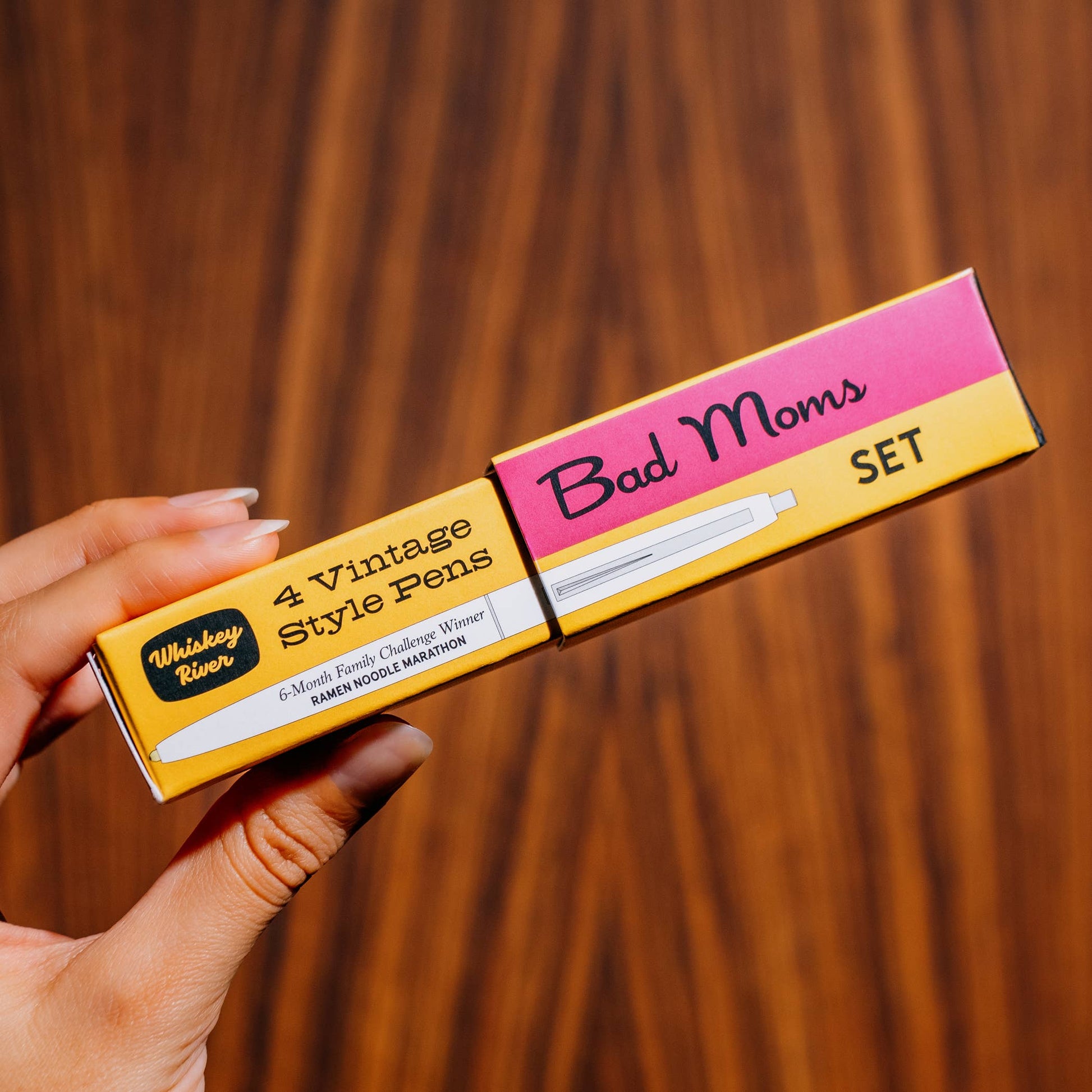 This witty pen set features four smooth-writing black ballpoint pens packaged in a vibrant, durable two-piece box—perfect for the mom who deserves a laugh. A playful nod to imperfect parenting, these USA-made pens from Whiskey River Soap Co. are as fun to give as they are practical to use.
