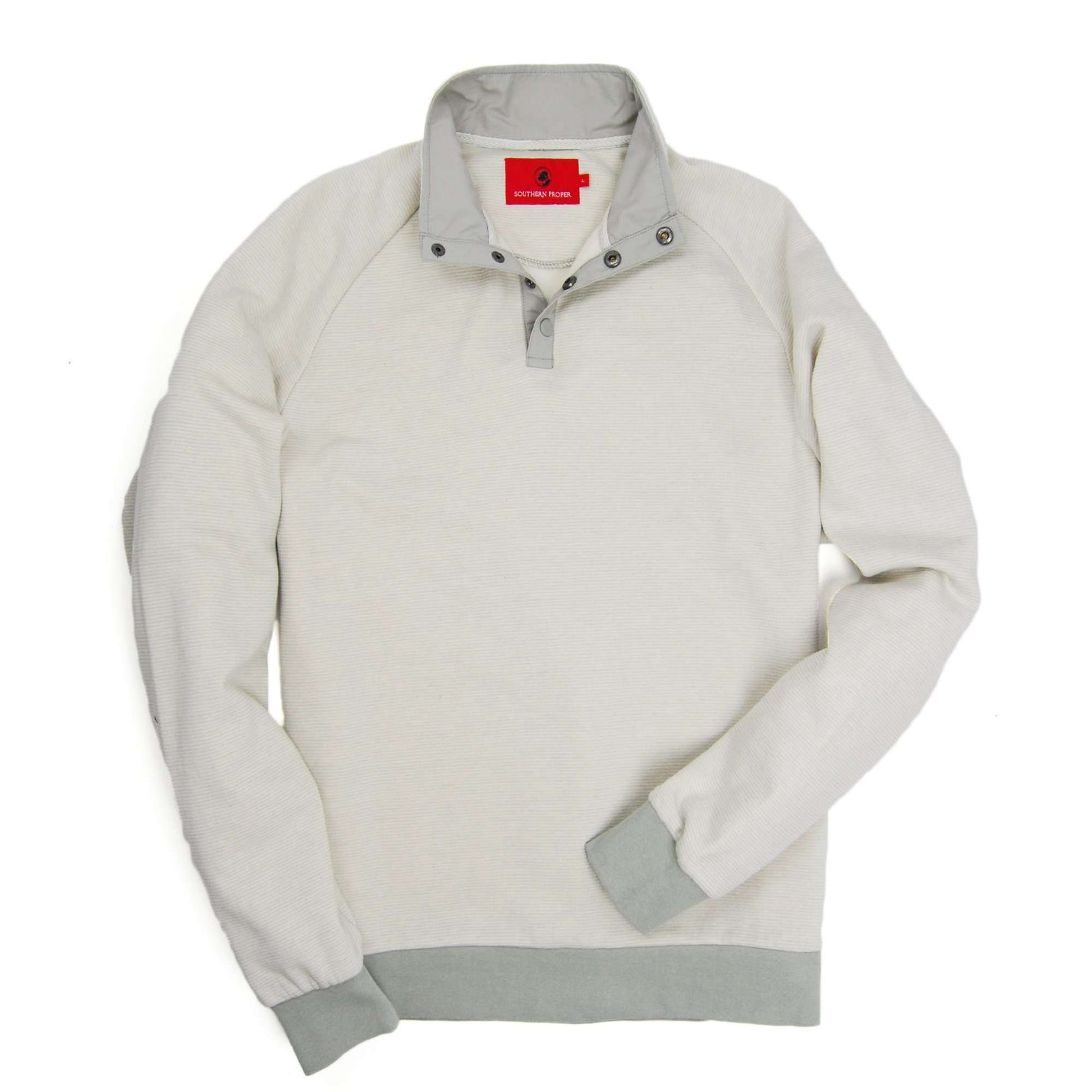 Our take on the classic sweatshirt. This pullover has a stand-up collar and four-snap placket and contrasting accents. The ribbed fabric around the waist and cuffs helps retain heat, keeping you warm and cozy. The brushed interior of the cotton blend fabric feels softer than your favorite sweatshirt for maximum comfort.