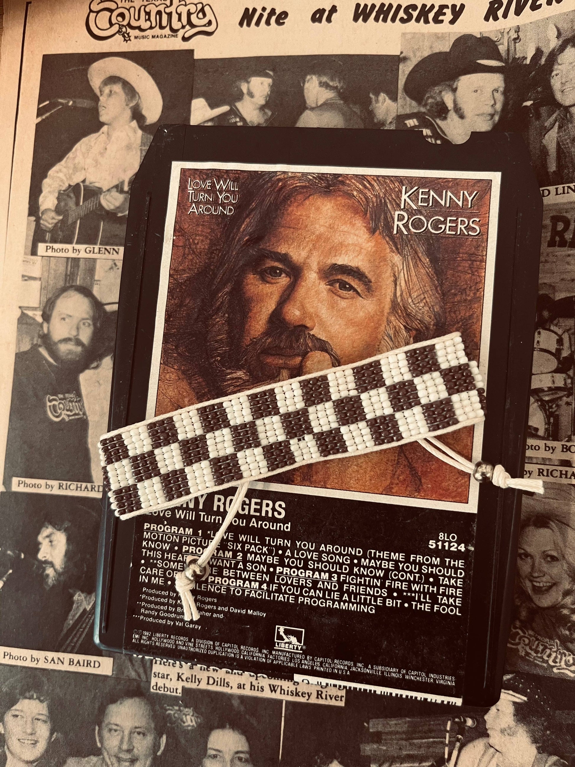 * White and brown checkered bead detailing.