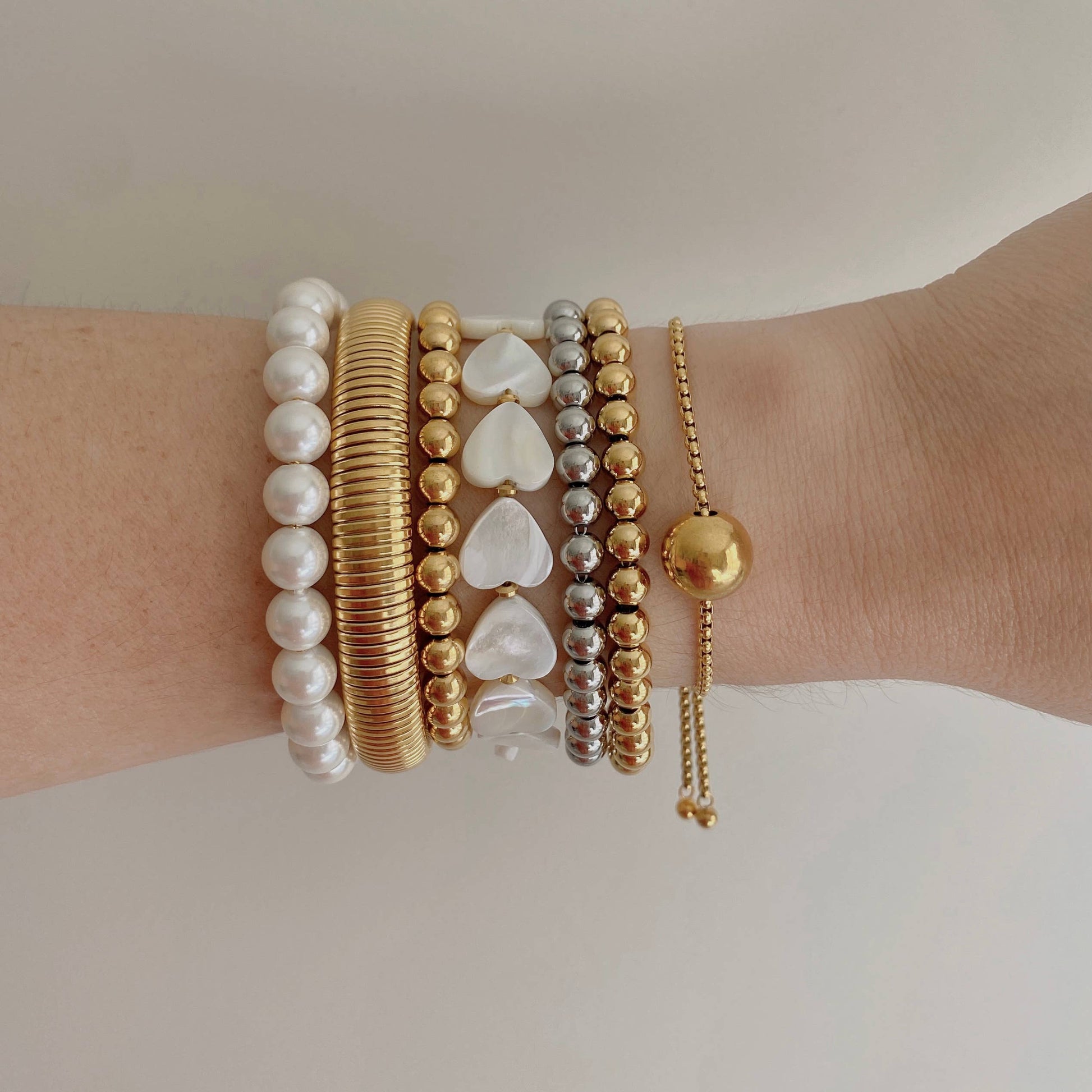 ā” Lovely heart shaped shell pearls bracelet. Great to wear by itself or styled with more bracelets!