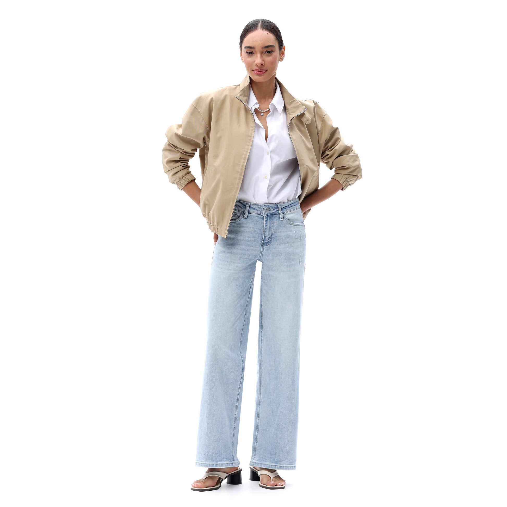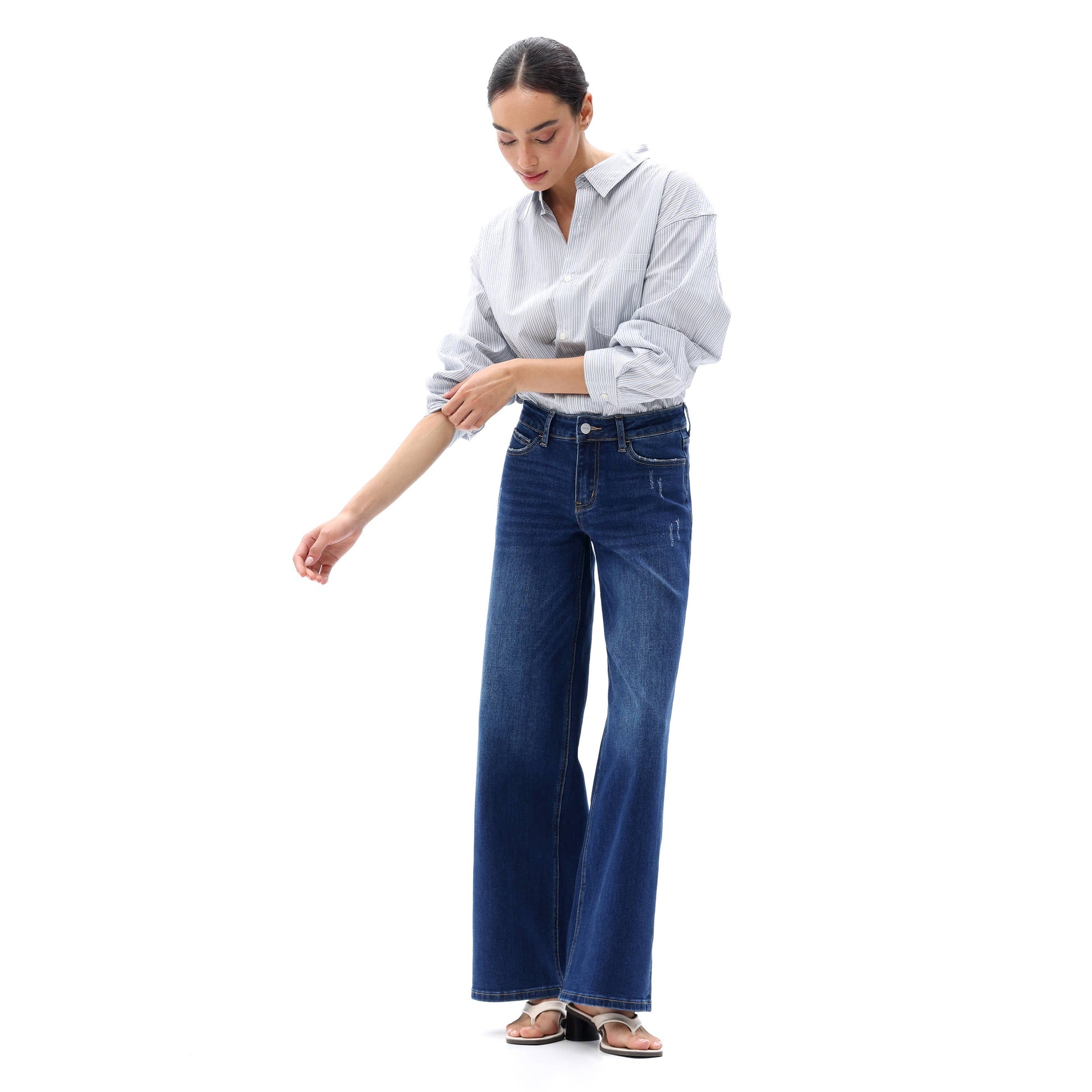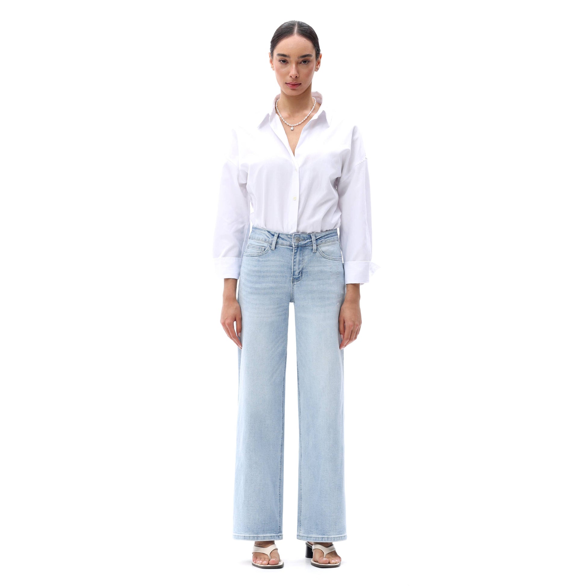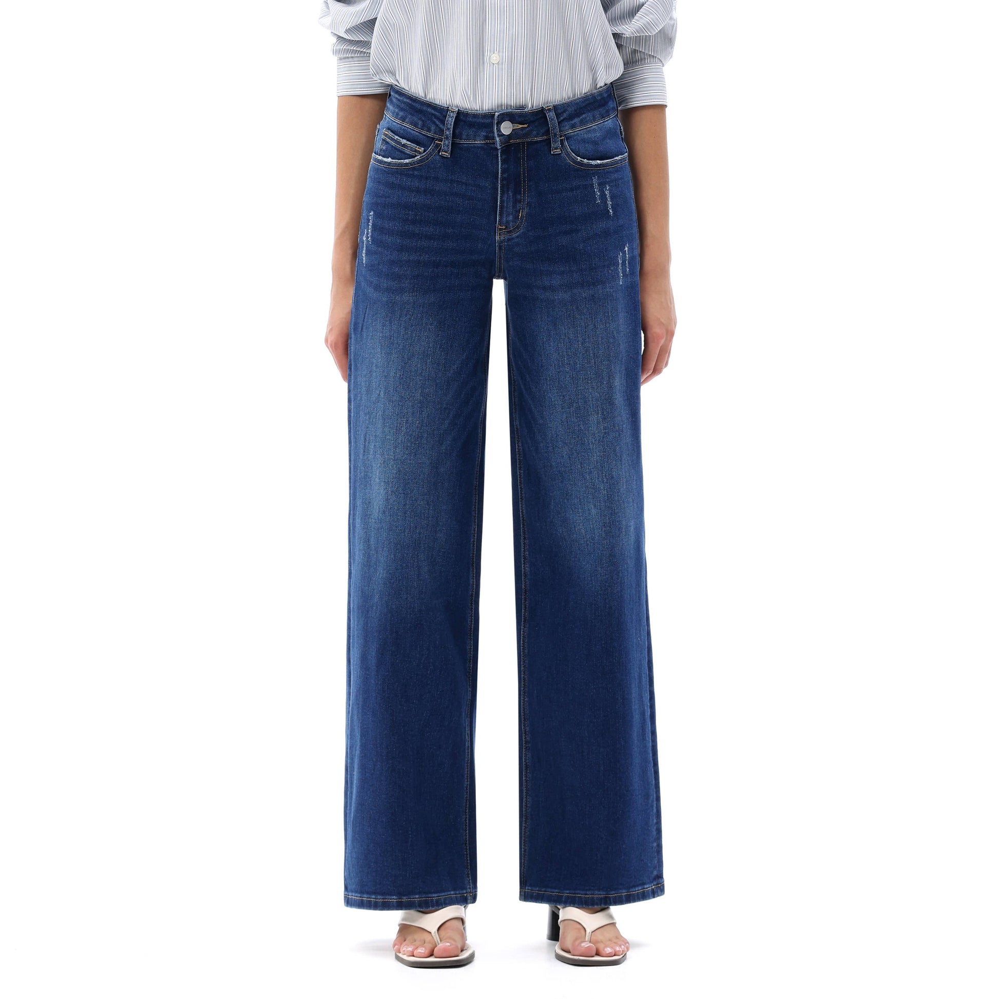 These mid-rise wide-leg denim jeans combine a universally flattering mid-waist fit with a relaxed, flowy silhouette, distressed, while their high-stretch fabric ensures effortless comfort and versatility for everyday styling.
