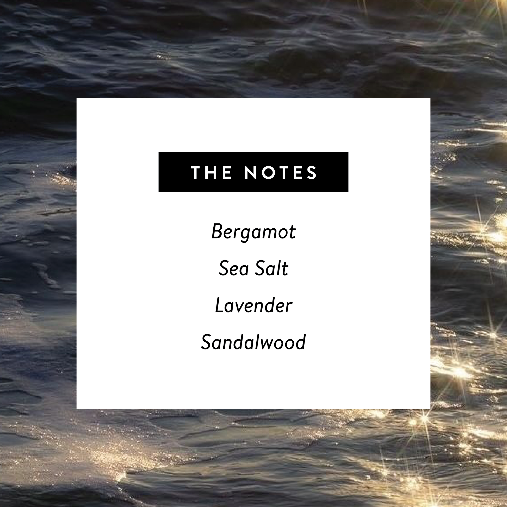 Salty air, stolen glances, moonlit rendezvous. Fresh and marine-inspired with soothing lavender, finishing in a musky sandalwood embrace. Think careless whispers and sleeping in his t-shirt.