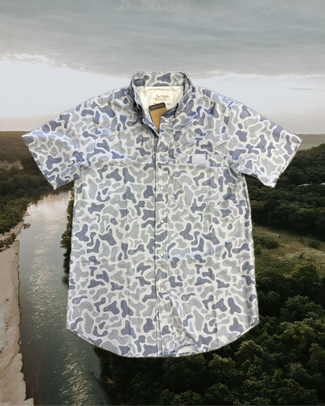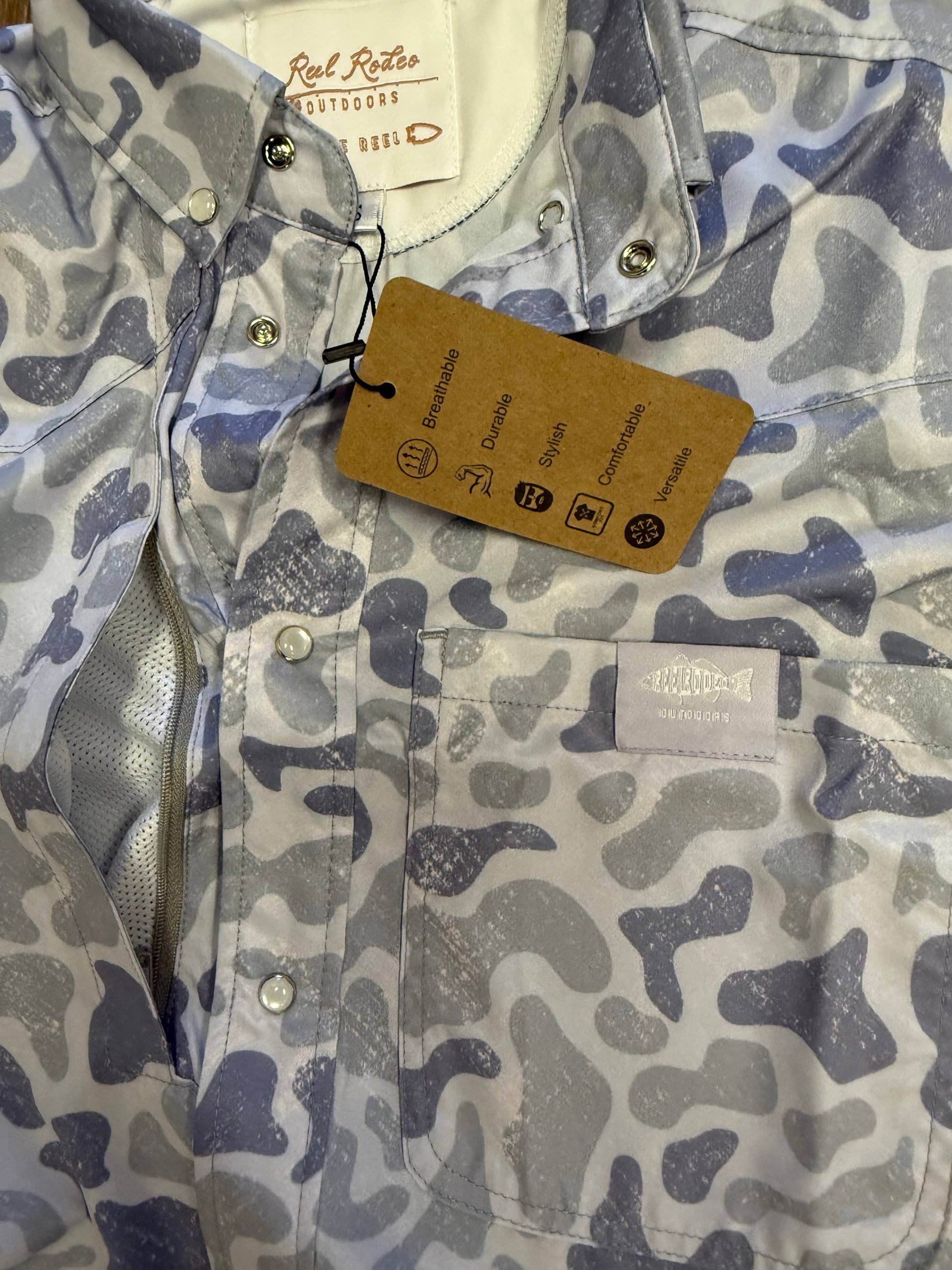 Rock a shirt that means something. This pearl snap button-down features the iconic Salt & Light Reel Rodeo camo pattern that turns heads at the rodeo or around town. Slip your essentials into the hidden zipper pocket, while the front left chest RRO pocket label and inside Faith & Freedom label keep your values front and center. Style meets substance in one seriously cool piece.