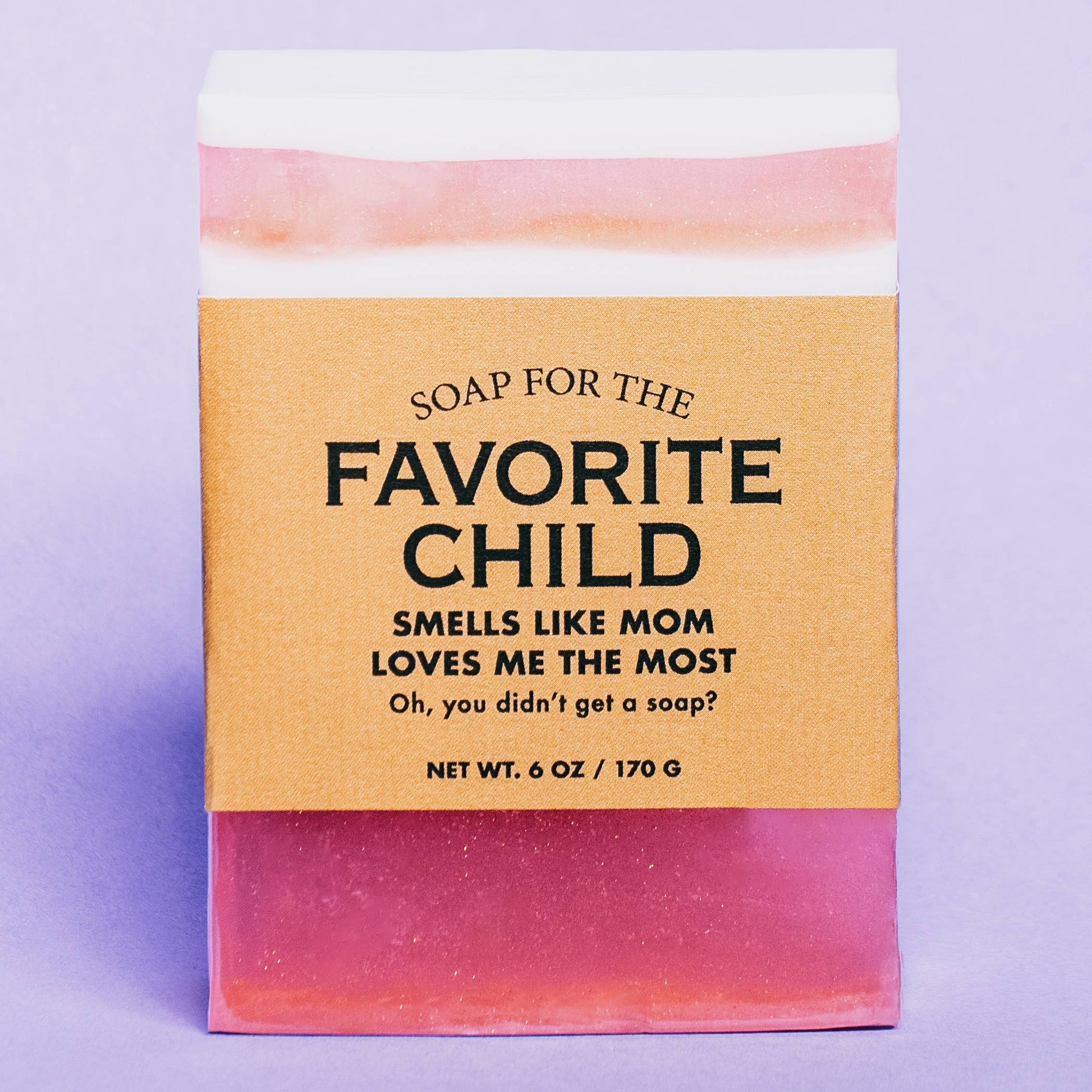 This witty soap celebrates sibling rivalry with tongue-in-cheek humor. A self-proclaimed favorite child boasts about their superior qualities—intelligence, charm, and good looks—while maintaining they're too modest to really brag about it. The playful narrative suggests you're the lucky one to have such a fabulous sibling around. Handcrafted by Whiskey River Soap Co., this 6 oz vegan bar features a sophisticated Better Clothes scent. Each artisan-made soap is beautifully unique, with no two bars identical. Perfect for gifting to your favorite (or least favorite) family member.